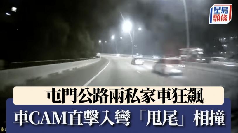 屯門公路今日凌晨發生車禍。網上流傳影片顯示,一輛深色私家車和一輛白色私家車沿屯門公路往荃灣方向高速飛馳,且發出巨大引擎聲,未幾即在一彎位相撞,同車同時死火,白色私家車更煙出大量白煙,司機及乘客急忙跳車。