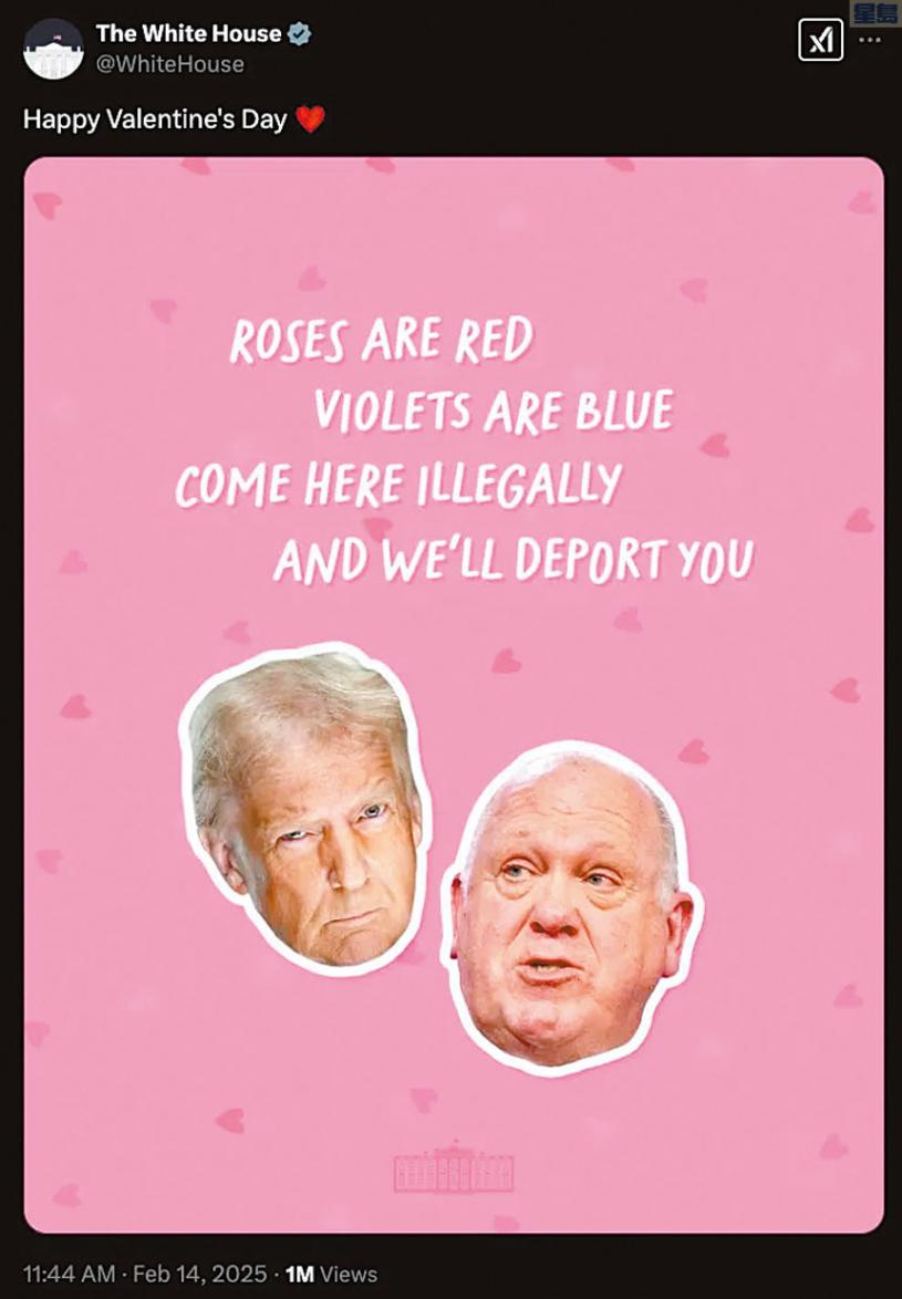 白宮14日在社群媒體賬號上發布了一張情人節賀卡,體現了特朗普政府強硬的移民政策,在網上引發強烈反彈。