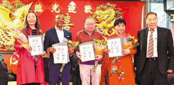 (右起)梁添光給廖青、胡運炤、德米西、劉紅頒發獎狀。李強攝