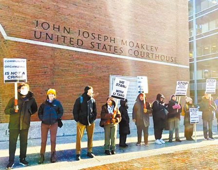梁利堂的支持者在波士頓聯邦法院外舉牌支持。