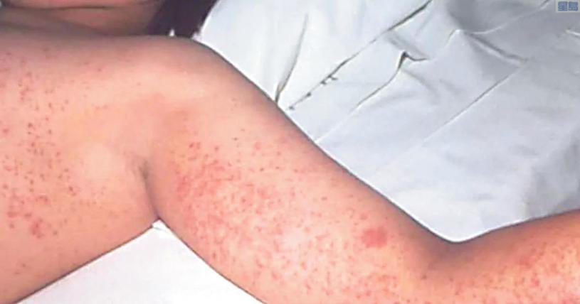 麻疹患者通常接觸病毒大約7至14天後發病,初期症狀包括發燒、咳嗽、流鼻水和眼睛發紅,口腔幾天後會出現小白點,臉部也開始出現紅疹,並逐漸擴散至全身。