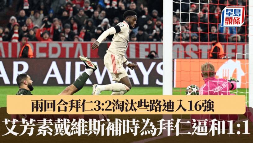 拜仁慕尼黑於周二的歐聯淘汰圈附加賽次回合,全靠中場艾芳素戴維斯(Alphonso Davies)於補時4分鐘的入球,主場以1:1逼和些路迪,兩回合以3:2淘汰些路迪驚險晉級16強。