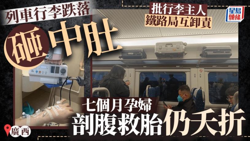 內地有孕婦在廣西南寧坐動車時,疑因行李擺放不當,遭由高處跌落行李擊中肚部。女事主自行求醫,顯示有胎盤早剝早產的風險,需要剖腹產子,但超早產的嬰兒兩日後離世。女事主不滿鐵路局和行李主人互推責任。廣州鐵路局已介入調查事件。