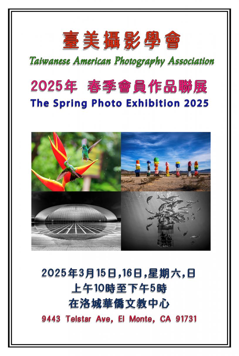 台美攝影學會將於2025年3月15日(星期六)和3月16日(星期天)舉行會員攝影聯展。此次聯展的作品是會員近期的攝影成果。我們非常榮幸能和朋友們共享 此次的展覽作品。
