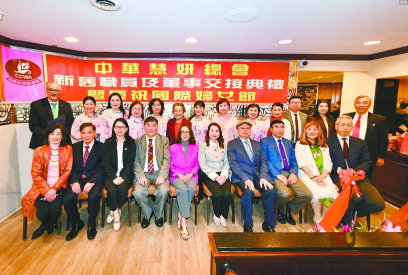 ( 僑社記者馬紅兵報導 )3月8日中午,中華慧妍總會舉行換屆交接典禮暨同慶三八國際婦女節。州參議員威善高、市參事陳小焱、三藩市長羅偉及助理梁莉娜、市府律師丘信福的助理陳俊樺、三藩市警察委員余健全等蒞臨祝賀並頒發賀狀;中華總會館總董暨肇慶總會館主席吉鴻雁;合和總會館主席余健峰、前任主席謝躍池;岡州總會館副主席黃國康;通事劉榮浩;星島日報美西版副總經理董少英、警察局高級分析師梁林靜宇暨僑界嘉賓親臨祝福,共襄盛會。中華慧妍總會滿任會長黎碧鳴、新任會長張曉春;共同創辦人李人芝;法律顧問郭麗蓮;名譽會長方謝潔霞、高慧琍;顧問彭書城;第一副會長楊鄭玉英、第二副會長楊江紅、財政張藍真、程伊娜、書記林妙霞、董事范麗冬出席交接典禮。名譽會長高慧琍主持交接儀式。