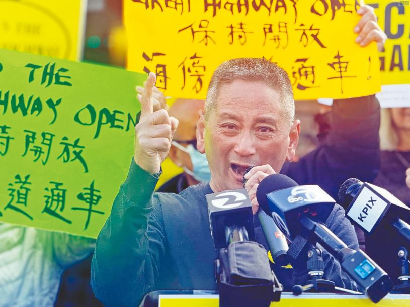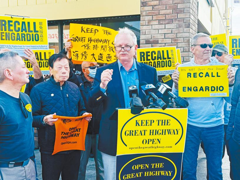 昨日(11日)中午,約60名反對K提案的社區領袖和居民,聚集在三藩市日落區Irving街商圈召開新聞發布會,宣布對三藩市政府及五位市參事提起訴訟,挑戰K提案的合法性。與會民眾高舉「保持沿海大公路開放」及「罷免第四區市參事殷嘉立(Joel Engardio)」的標語牌。
