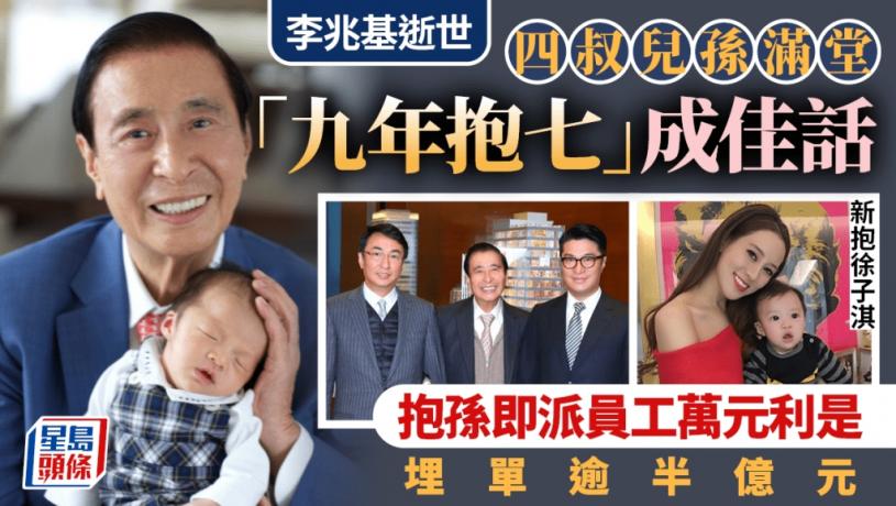恒基地產集團創辦人李兆基逝世,終年97歲。「四叔」一生兒孫滿堂,有兩子三女,其中最為人熟知的就是「九年抱七」,長子李家傑透過代母產下3胞胎,而次子李家誠太太、知名藝人徐子淇亦為四叔帶來4個孫,令四叔在9年內7度抱孫,家有喜事的四叔更向員工大派利是,保守估計共派5,300萬元。