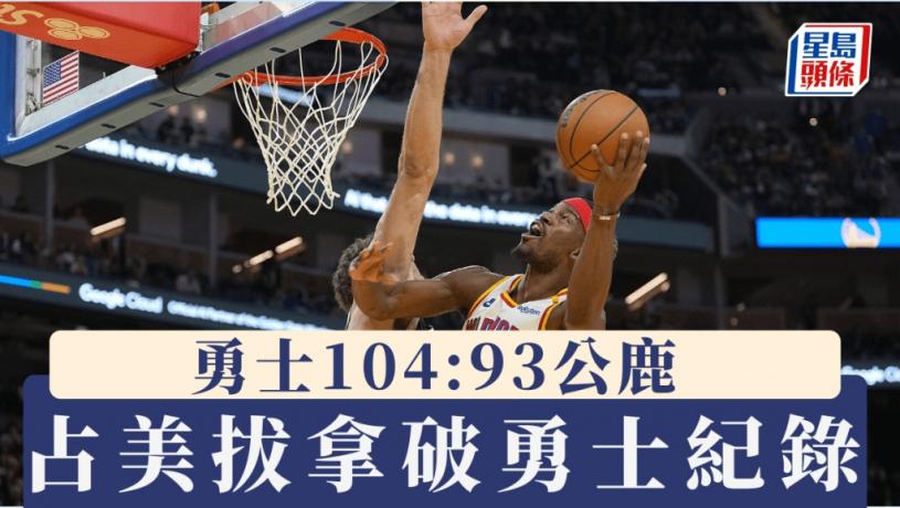 勇士周二主場對公鹿在「射神」史堤芬居利休戰之下,由小前鋒占美拔拿(Jimmy Butler)肩負得分重任,投進全場最高的24分,帶領勇士勝104:93。而占美拔拿自2月由熱火轉投勇士,上陣17仗已累積100個籃板和100次助攻,刷新隊史最快紀錄。