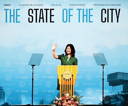 周三晚,波士頓市長吳弭在位於芬威棒球場附近的MGM音樂廳,面對數千名聽眾發表2025年波士頓市情咨文。吳市長在演講中力推多項新舉措,並強調波士頓不會被特朗普政府的言論所恫嚇,獲得全場聽眾熱烈掌聲。