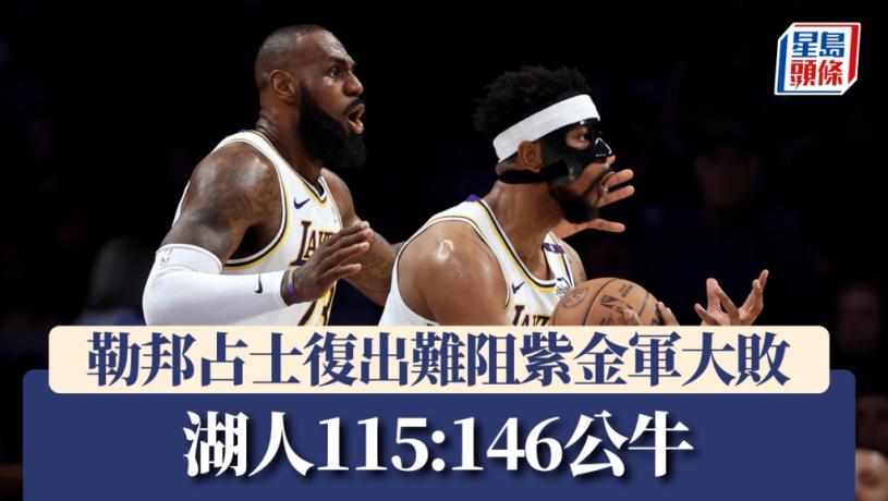湖人主將勒邦占士(LeBron James)因腹股溝傷患缺陣了7場,周六主場對公牛復出卻未能阻止紫金軍輸波。勒邦占士貢獻17分,湖人另一巨頭當積(Luka Doncic)投進全隊最高34分,惟紫金軍今仗有多達21次失誤,送給對手27分,最終以115:146大敗給公牛。
