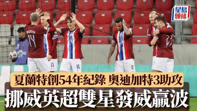 周二世界盃外圍賽歐洲區I組,挪威於中立場以4:2輕取以色列,2戰全勝高踞榜首。挪威一對英超孖寶今場表現神勇,曼城射手艾寧夏蘭特攻入1球,成近54年最快為國家隊入40球的歐洲球員,而阿仙奴中場馬田奧迪加特則完成助攻帽子戲法。