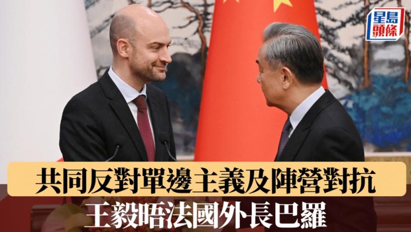 外長王毅今日與到訪的法國外長巴羅(Jean-Noel Barrot)在北京舉行會議。會後一起見記者時王毅表示,雙方認為,面對國際格局的深刻演變,雙方應堅持以多邊主義反對單邊主義,以對話協作反對陣營對抗,以互利共贏反對脫鉤斷鏈。