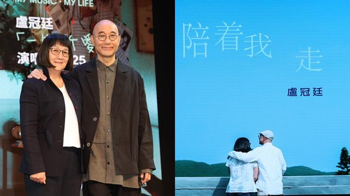 早前在頒獎禮上獲得終身成就獎,盧冠廷感到是人生的一份最大禮物,他解釋,因為當年與太太未結婚前,外母跟外父說,女兒嫁給一個唱歌的,行不行?外父當時跟外母說:「要相信女兒的感覺,有些東西是她看到而我們看不到的。」盧冠廷說這些說話他放在心中,陪伴成長,「我太太的父母在天也能感受到。」盧冠廷自爆,想要求太太創作一首歌真的很難,而這次演唱會的主題曲《陪着我走》,竟不需懇求,太太自願出手填詞,他同時解釋,旋律優美,她自然會想填詞。在旁的唐書琛表示,當年(1985年)創作《陪着你走》是代表「目標」和「希望」,而《陪着我走》是「人生中途站」,像他倆現在階段,是人生領悟中途站,還未結束。她說老公收到歌詞,唱了兩句便哭了出來,起初還以為他在笑。盧冠廷表示,《陪着我走》的歌詞很奇妙,有入心入肺帶你去另一境界的感覺,當收到歌詞便忍不住哭過不停。