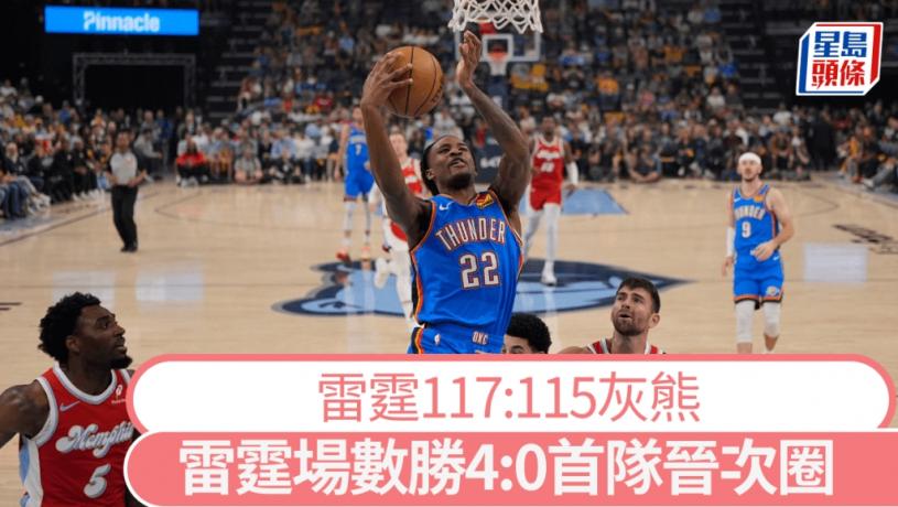 雷霆作客灰熊的NBA季後賽西岸首圈第4回合,雷霆乘對手主將莫蘭特倦勤下反客為主,憑基傑奧斯亞歷山大投進全場最高的38分,領軍以117:115,2分之差僅勝灰熊,並以場數4:0掃走灰熊成為首支晉級季後賽次圈球隊。