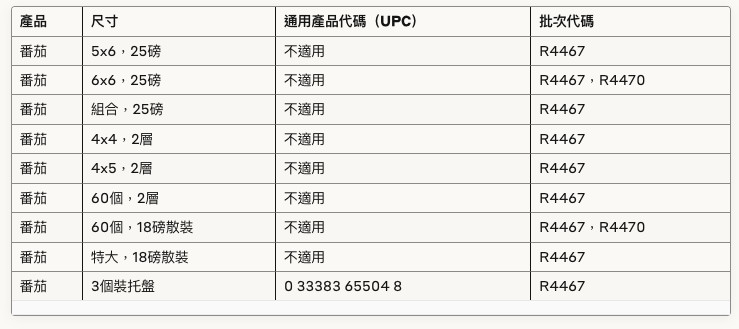 而威廉姆斯農場重新包裝的召回產品涵蓋多種規格,包括25磅裝、18磅散裝以及3個裝托盤等,批次代碼主要為R4467和R4470。