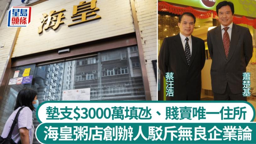 海皇粥店日前突然全線結業,多名員工控訴公司拖糧,勞工處指至今收近百人求助,追討約1,500萬元。海皇粥店創辦人蕭楚基和蔡汪浩今日(9日)發聯合聲明,強調已經「用盡一切方法嘗試挽救公司及公司業務」,又墊支3,000多萬元填補公司賬目,甚至連二人唯一的居住物業都已被賤賣。