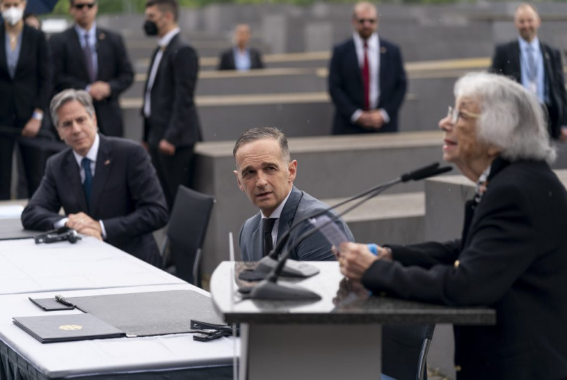 U.S. Secretary of State Antony Blinken, left, and German Minister of Foreign Affairs Heiko Maas, center, listen as Holocaust Survivor Margot Friedlander, right, speaks during a ceremony for the launch of a U.S.-Germany Dialogue on Holocaust Issues at the Memorial to the Murdered Jews of Europe in Berlin, Thursday, June 24, 2021. Blinken is on a week long trip in Europe traveling to Germany, France and Italy. (AP Photo/Andrew Harnik, Pool)