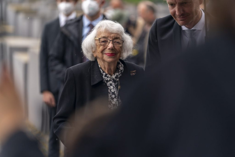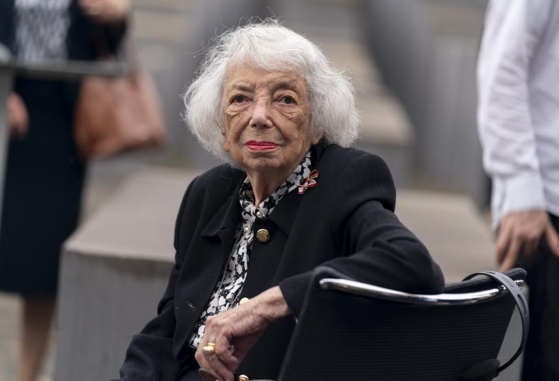 Holocaust Survivor Margot Friedlander steps away from the podium after speaking at a ceremony attended by U.S. Secretary of State Antony Blinken and German Minister of Foreign Affairs Heiko Maas for the launch of a U.S.-Germany Dialogue on Holocaust Issues at the Memorial to the Murdered Jews of Europe in Berlin, Thursday, June 24, 2021. Blinken is on a week long trip in Europe traveling to Germany, France and Italy. (AP Photo/Andrew Harnik, Pool)