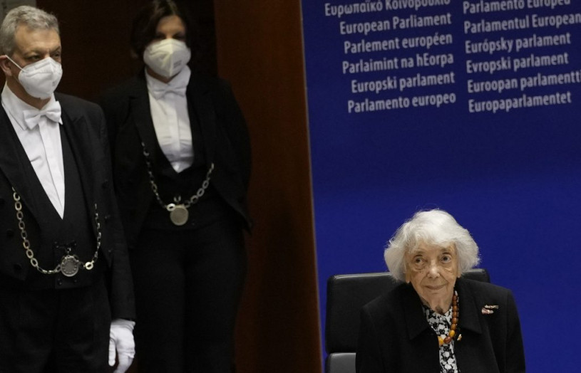Holocaust survivor Margot Friedlander addresses the plenary chamber at the European Parliament in Brussels, Thursday, Jan. 27, 2022. European Union lawmakers observed a minute’s silence Thursday, and welcomed centenarian Holocaust survivor Margot Friedlander, as the world commemorates the 77th anniversary of the liberation of the Auschwitz concentration camp during commemorations of International Holocaust Remembrance Day. (AP Photo/Virginia Mayo)