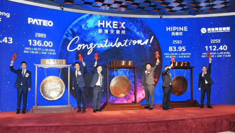 今日有3隻新股掛牌,當中焦點為由紫金礦業(2899)分拆出來的紫金黃金國際(2259),暫為本地今年集資額第二大新股,集資249.8億元,今早股價向好,曾升逾67%至120元,半日則升60%至115.1元。本港再有大型新股掛牌下,吸引財庫局局長許正宇、港交所(388)主席唐家成、港交所行政總裁陳翊庭,以及證監會主席黃天祐到場祝賀,但均未有公開發言。另一方面,宏高證券投資經理梁杰文表示,今日3隻新股質素最佳是紫金黃金國際,若投資者沒貨或不夠貨,又對金價仍有信心,抱着短炒心態可追貨。至於西普尼(2583)及博泰車聯(2889),他認為估值較高,有貨者宜沽貨鎖定利潤。