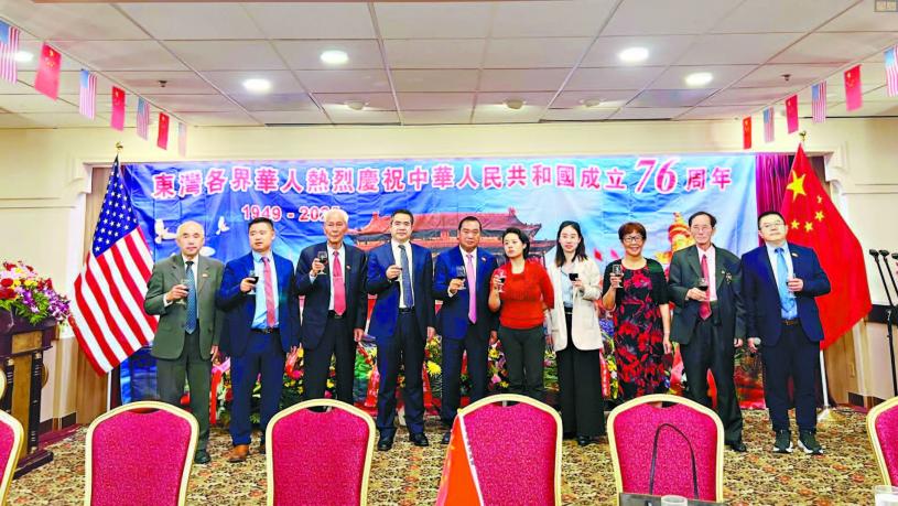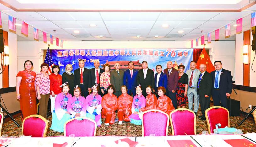 ( 僑社記者馬紅兵報導 )9月26日晚上六時,東灣國慶委員會聯合東灣各界華僑華人團體,在屋崙金牡丹海鮮茶寮舉行慶祝中華人民共和國成立76週年晚宴。中領館副總領事楊守征、領事姚瑤;屋崙市第二區議員王夏琳、助理余詩敏、屋崙不分區市議員羅威娜布郎、阿拉米達縣議員譚蓮娜代表、幕僚長塞斯利‧弗羅斯特、圣萊安德羅市副市 少華-鮑文、阿拉米達縣議員尹 沙- 爾克期、AIMS 校監Ms. Maya Woods;陽和總會館主席陳國慶、舊金山灣區中國統一促進會副理事長雷振澤、李國宏、第一副會長麥永康、副會長池德智等親臨共慶。東灣國慶委員會首席執行主席黃建成;執行主席曹翊翎、李蔚雲、梁廣陽、馬作林;秘書長鄺偉、副秘書長余志毅;顧問林龍安、趙國健、歐福安暨委員,以及東灣僑界首長、嘉賓共逾五百人出席聯歡,共襄盛會。秘書長鄺偉、羅志賢共同擔任晚宴司儀。