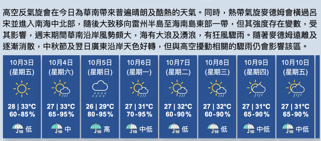 展望明日日間酷熱,稍後至星期日風勢頗大,間中有狂風驟雨,海有大浪及湧浪。星期日稍後驟雨減少。中秋節及翌日部分時間有陽光,有幾陣驟雨。