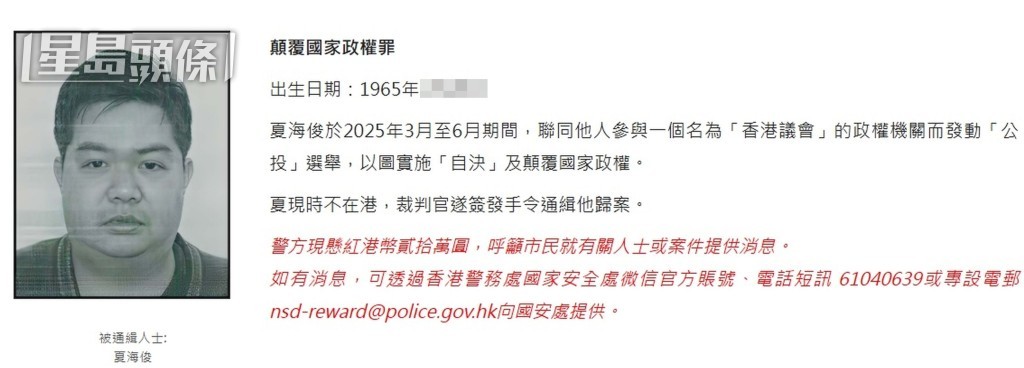 夏海俊於今年7月25日被警方國安處懸紅20萬元通緝,並於同年8月4日被刊憲列為「指明潛逃者」。他被指於今年3月至6月期間,聯同他人參與一個名為「香港議會」的政權機關而發動「公投」選舉,以圖實施「自決」及顛覆國家政權。夏不在香港,裁判官遂簽發手令通緝他歸案。