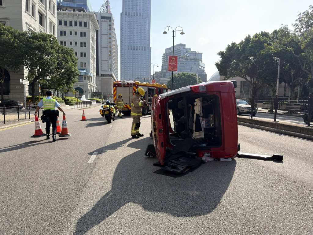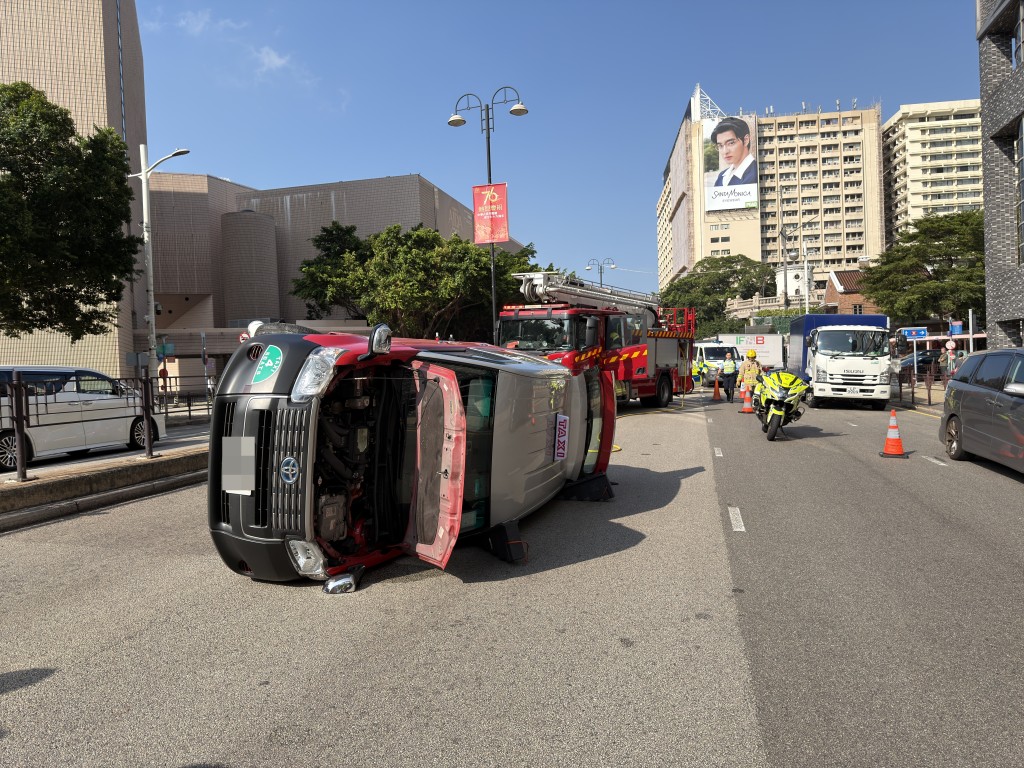 尖沙咀發生的士翻車意外。今日(9日)早上8時47分,一輛的士沿九龍公園徑行駛左轉入梳士巴利道,並駛往紅磡方向,其間途至梳士巴利道41號香港基督教青年會對開突然失事,撞壆向左翻側。司機受輕傷一度被困車上,救援人員到場,幸他已自行爬出車外,並由救護員帶上救護車接受治理。