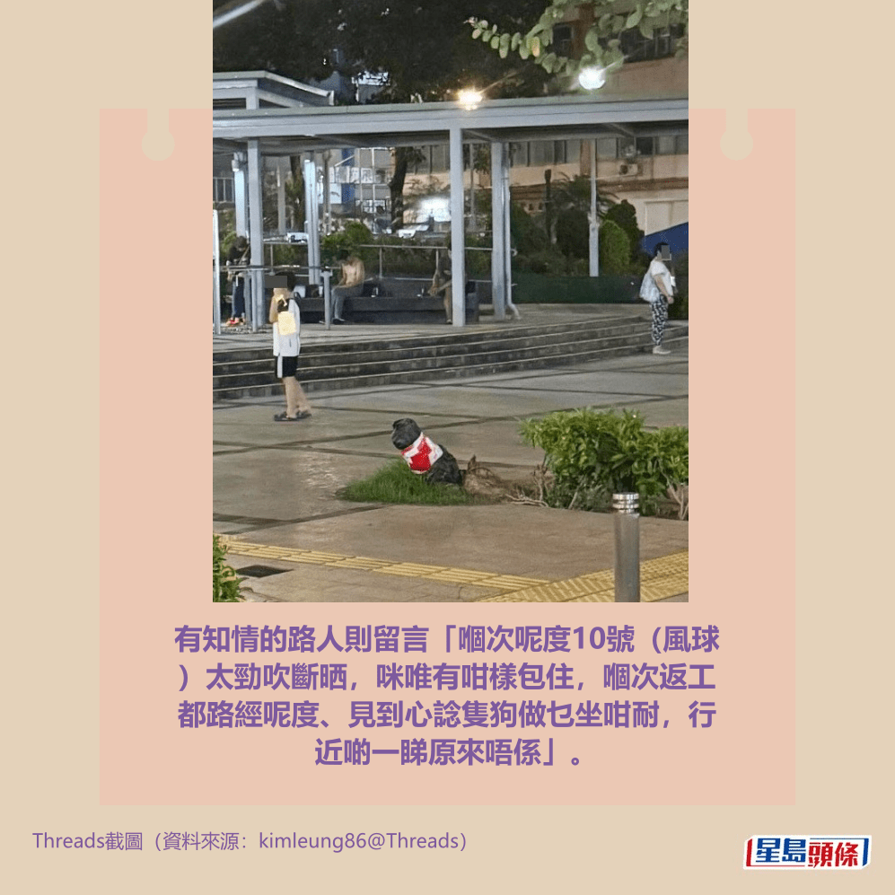 有知情的路人則留言「嗰次呢度10號(風球)太勁吹斷晒,咪唯有咁樣包住,嗰次返工都路經呢度、見到心諗隻狗做乜坐咁耐,行近啲一睇原來唔係」。