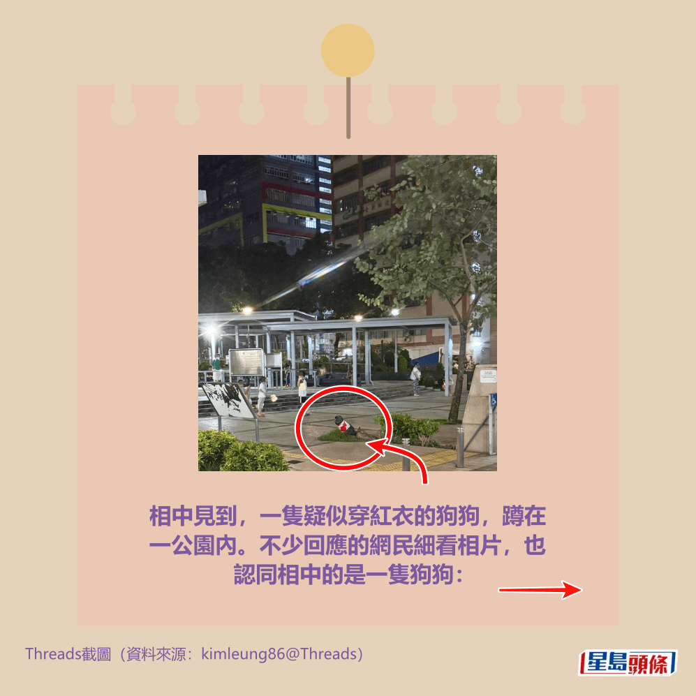 相中見到,一隻疑似穿紅衣的狗狗蹲在一公園內。不少回應的網民細看相片,也認同相中的是一隻狗狗: