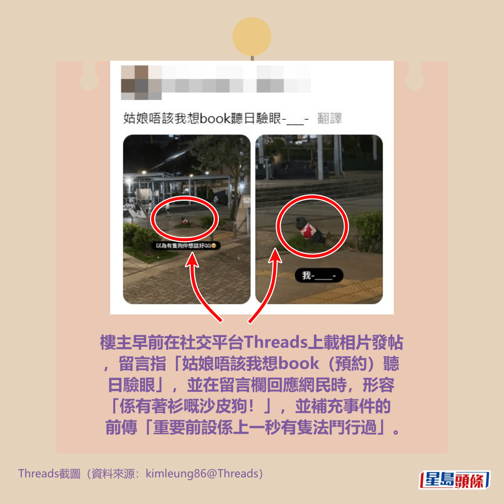 樓主早前在社交平台Threads上載相片發帖,留言指「姑娘唔該我想book(預約)聽日驗眼」,並在留言欄回應網民時,形容「係有著衫嘅沙皮狗!」,並補充事件的前傳「重要前設係上一秒有隻法鬥行過」。