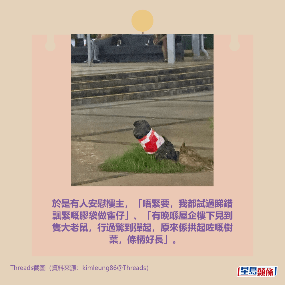 於是有人安慰樓主,「唔緊要,我都試過睇錯飄緊嘅膠袋做雀仔」、「有晚喺屋企樓下見到隻大老鼠,行過驚到彈起,原來係拱起咗嘅樹葉,條柄好長」。