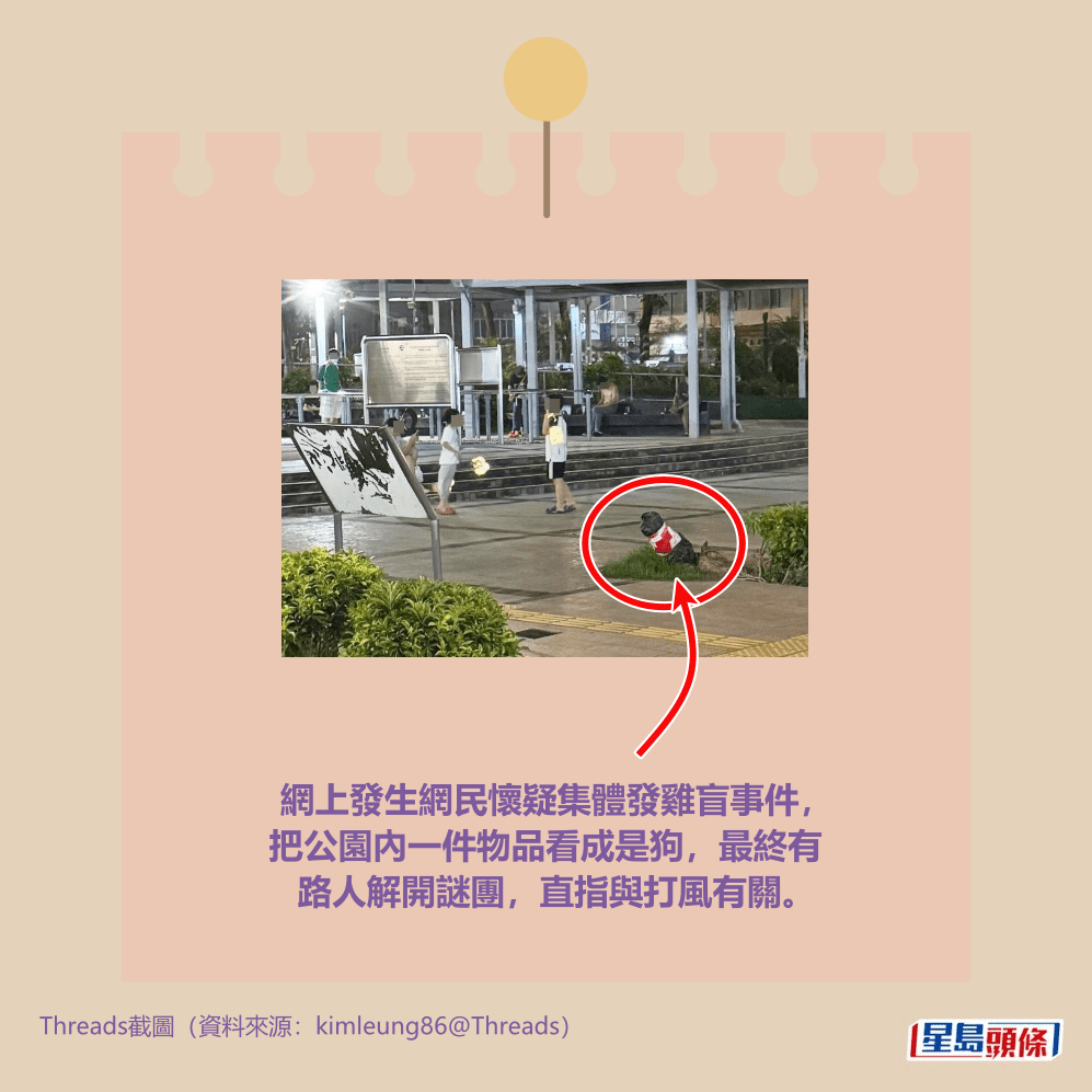 網上發生網民懷疑集體發雞盲事件,把公園內一件物品看成是狗,最終有路人解開謎團,直指與打風有關。詳情見下圖及下文: