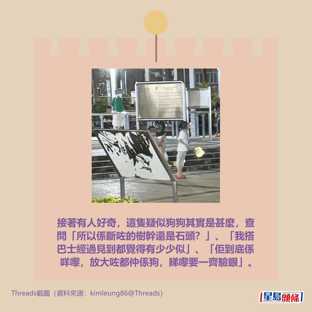 接著有人好奇,這隻疑似狗狗其實是甚麼,查問「所以係斷咗的樹幹還是石頭?」、「我搭巴士經過見到都覺得有少少似」、「佢到底係咩嚟,放大咗都仲係狗,睇嚟要一齊驗眼」。