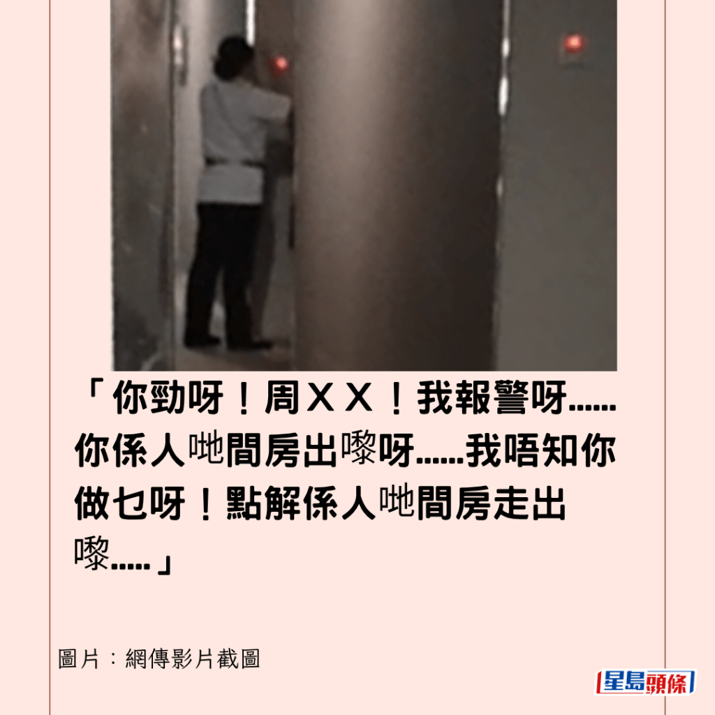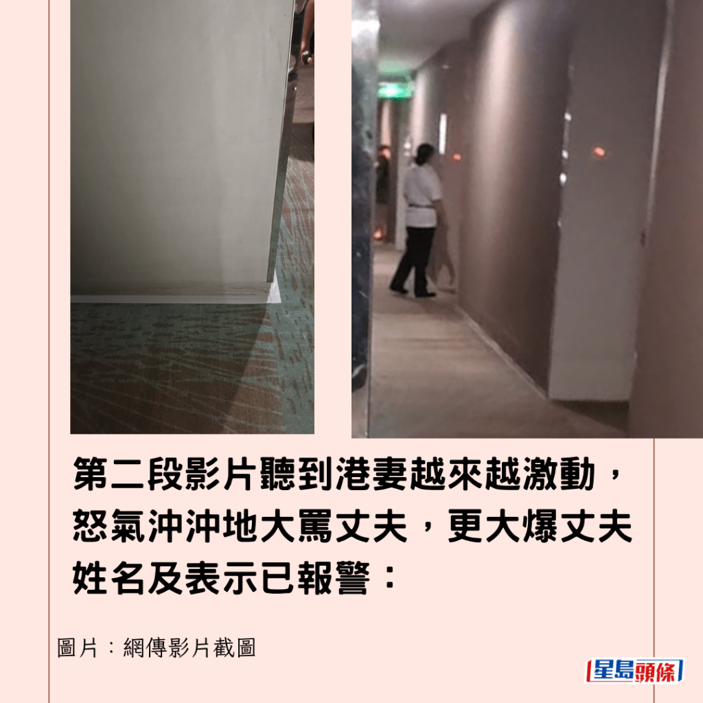 第二段影片聽到港妻越來越激動,怒氣沖沖地大罵丈夫,更大爆丈夫姓名及表示已報警:「你勁呀!周XX!我報警呀……你係人哋間房出嚟呀……我唔知你做乜呀!點解係人哋間房走出嚟…..」