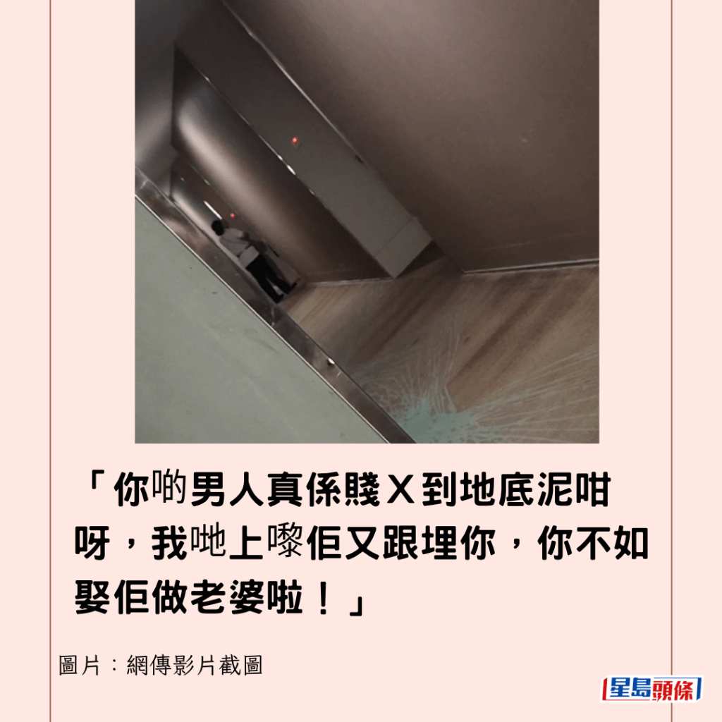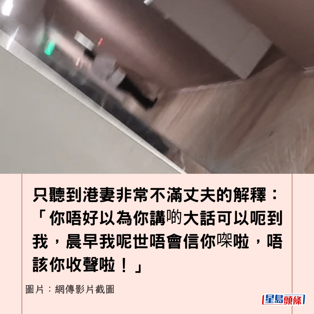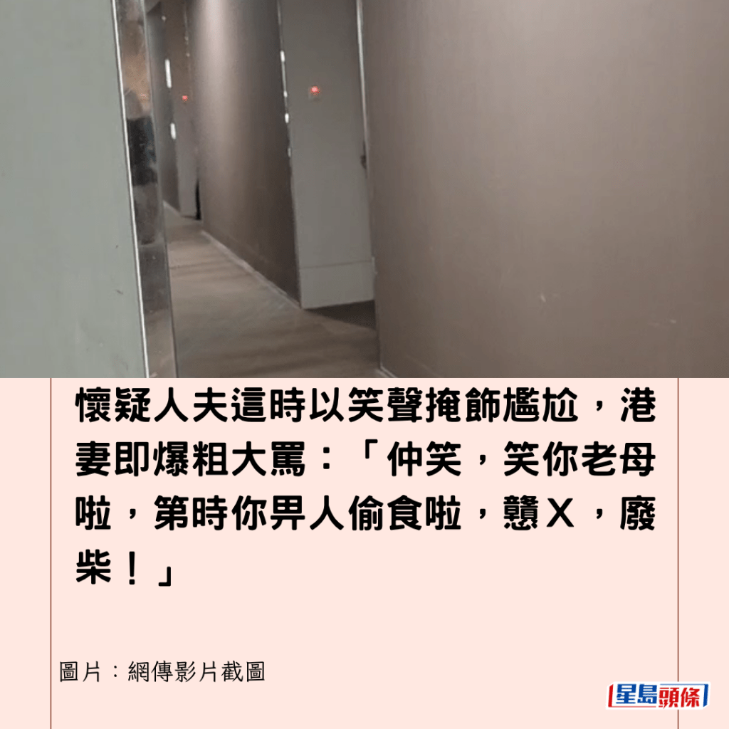 懷疑人夫這時以笑聲掩飾尷尬,港妻即爆粗大罵:「仲笑,笑你老母啦,第時你畀人偷食啦,戇X,廢柴!」