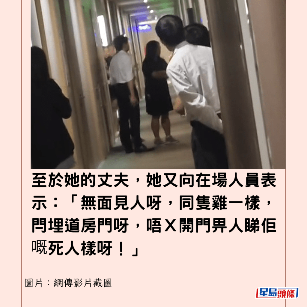 至於她的丈夫,她又向在場人員表示:「無面見人呀,同隻雞一樣,閂埋道房門呀,唔X開門畀人睇佢嘅死人樣呀!」