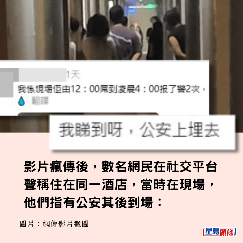 影片瘋傳後,數名網民在社交平台聲稱住在同一酒店,當時在現場,他們指有公安其後到場:「我係現場佢由12:00X到凌晨4:00,報了警2次。」「我睇到呀,公安上埋去。」