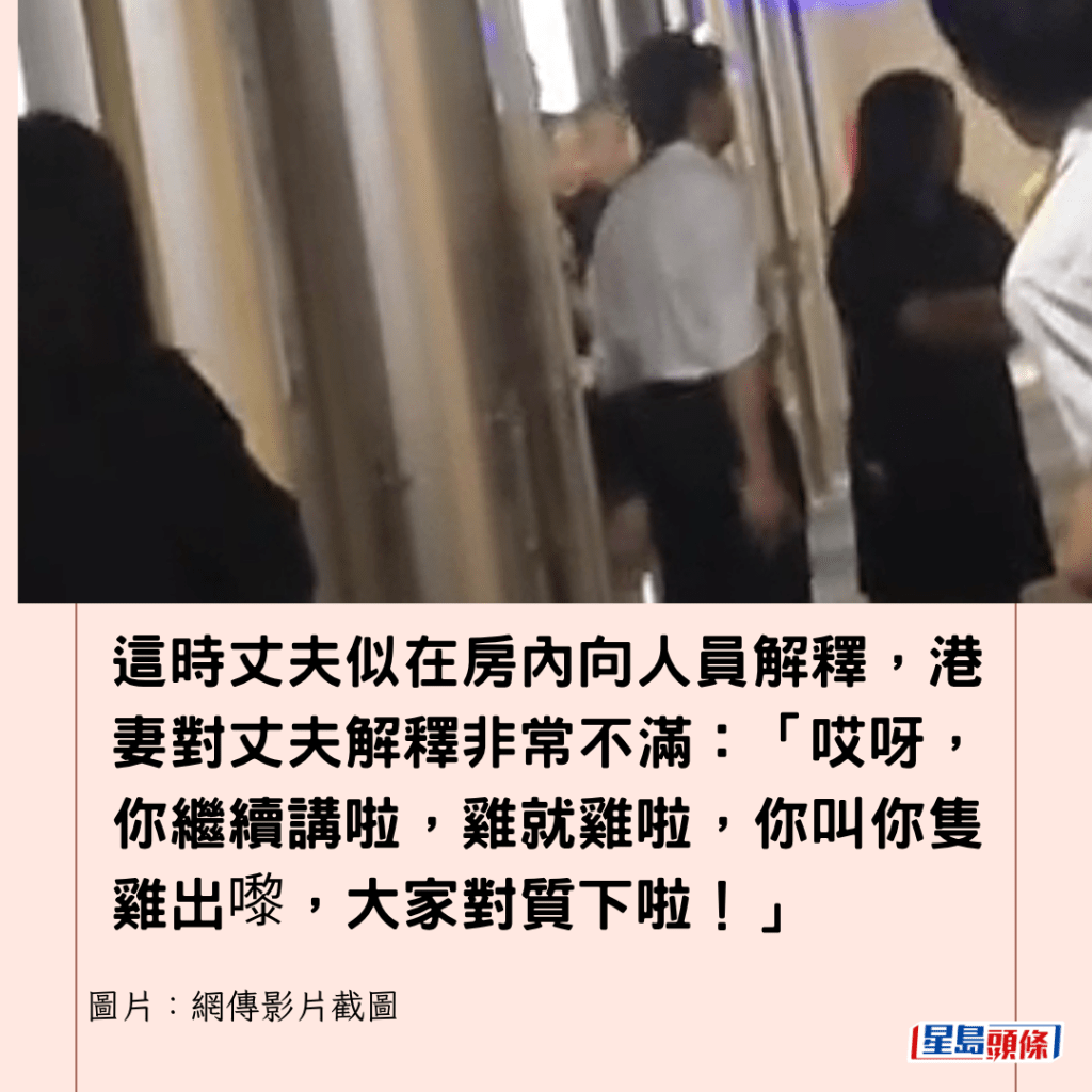 面對在場人員再三詢問,港妻顯得非常不耐煩:「佢養埋啲雞係到呀,什麼樣情況……」這時丈夫似在房內向人員解釋,港妻對丈夫解釋非常不滿:「哎呀,你繼續講啦,雞就雞啦,你叫你隻雞出嚟,大家對質下啦!」