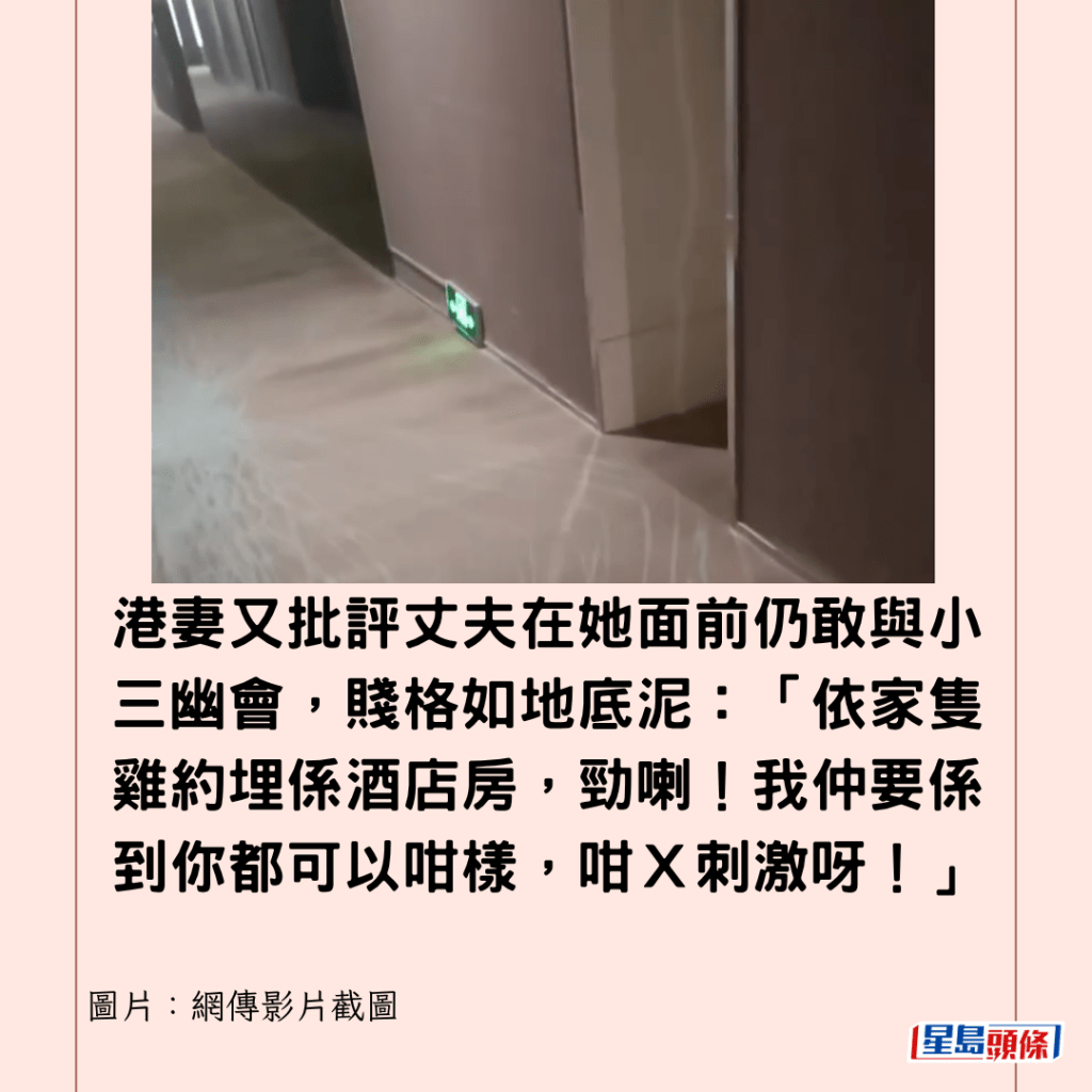 港妻又批評丈夫在她面前仍敢與小三幽會,賤格如地底泥:「依家隻雞約埋係酒店房,勁喇!我仲要係到你都可以咁樣,咁X刺激呀!」「你啲男人真係賤X到地底泥咁呀,我哋上嚟佢又跟埋你,你不如娶佢做老婆啦!」