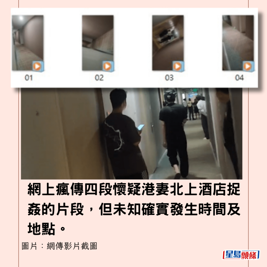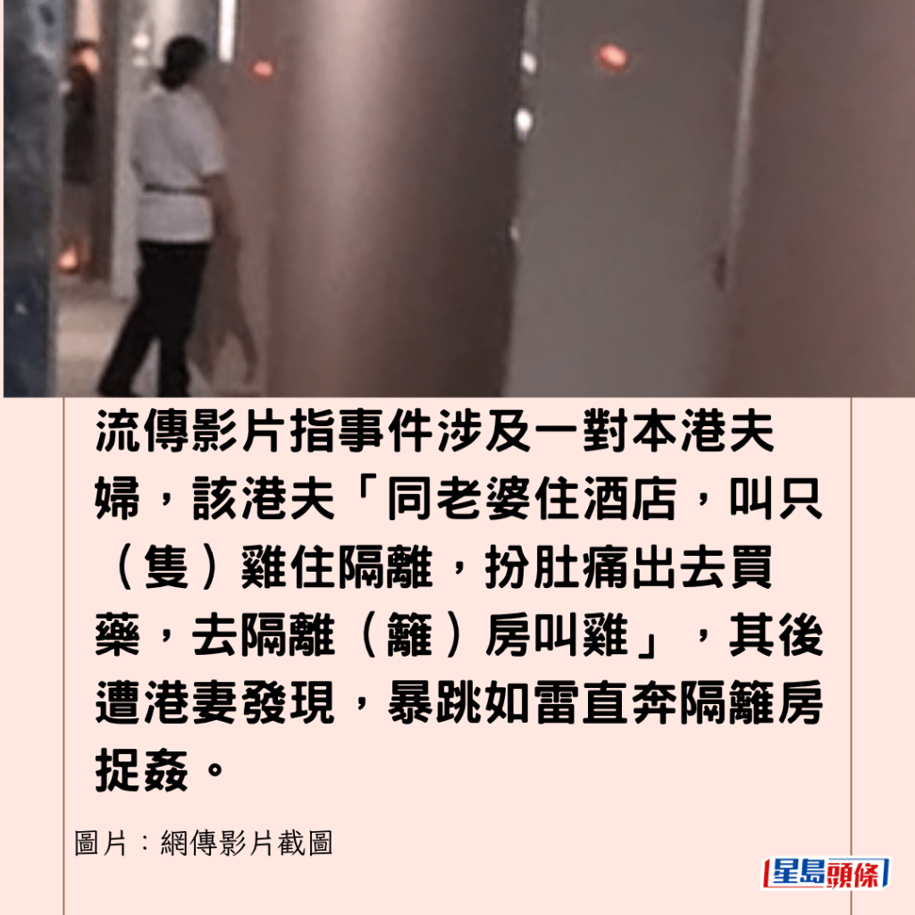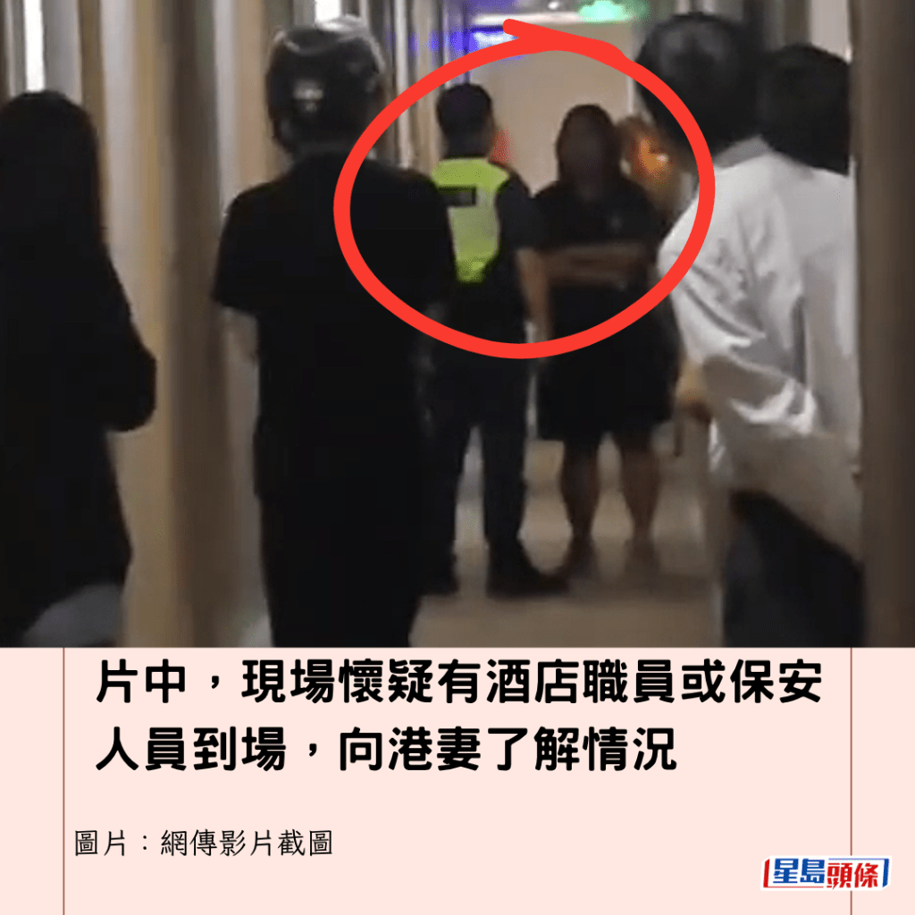 網上流傳四段事發時影片,但未知確實發生時間及地點,流傳影片指事件涉及一對本港夫婦,該港夫「同老婆住酒店,叫只(隻)雞住隔離,扮肚痛出去買藥,去隔離(籬)房叫雞」,其後遭港妻發現,暴跳如雷直奔隔籬房捉姦。