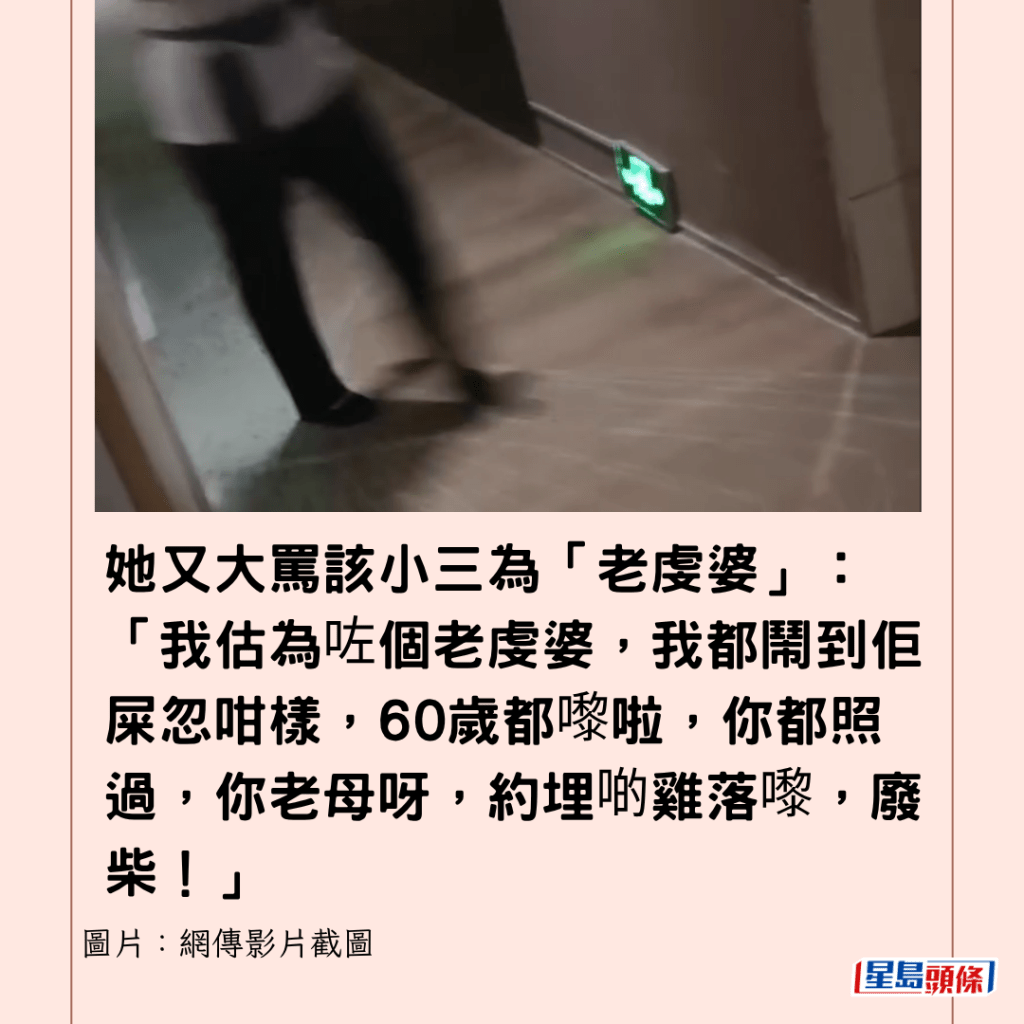 她又大罵該小三為「老虔婆」:「我估為咗個老虔婆,我都鬧到佢屎忽咁樣,60歲都嚟啦,你都照過,你老母呀,約埋啲雞落嚟,廢柴!」