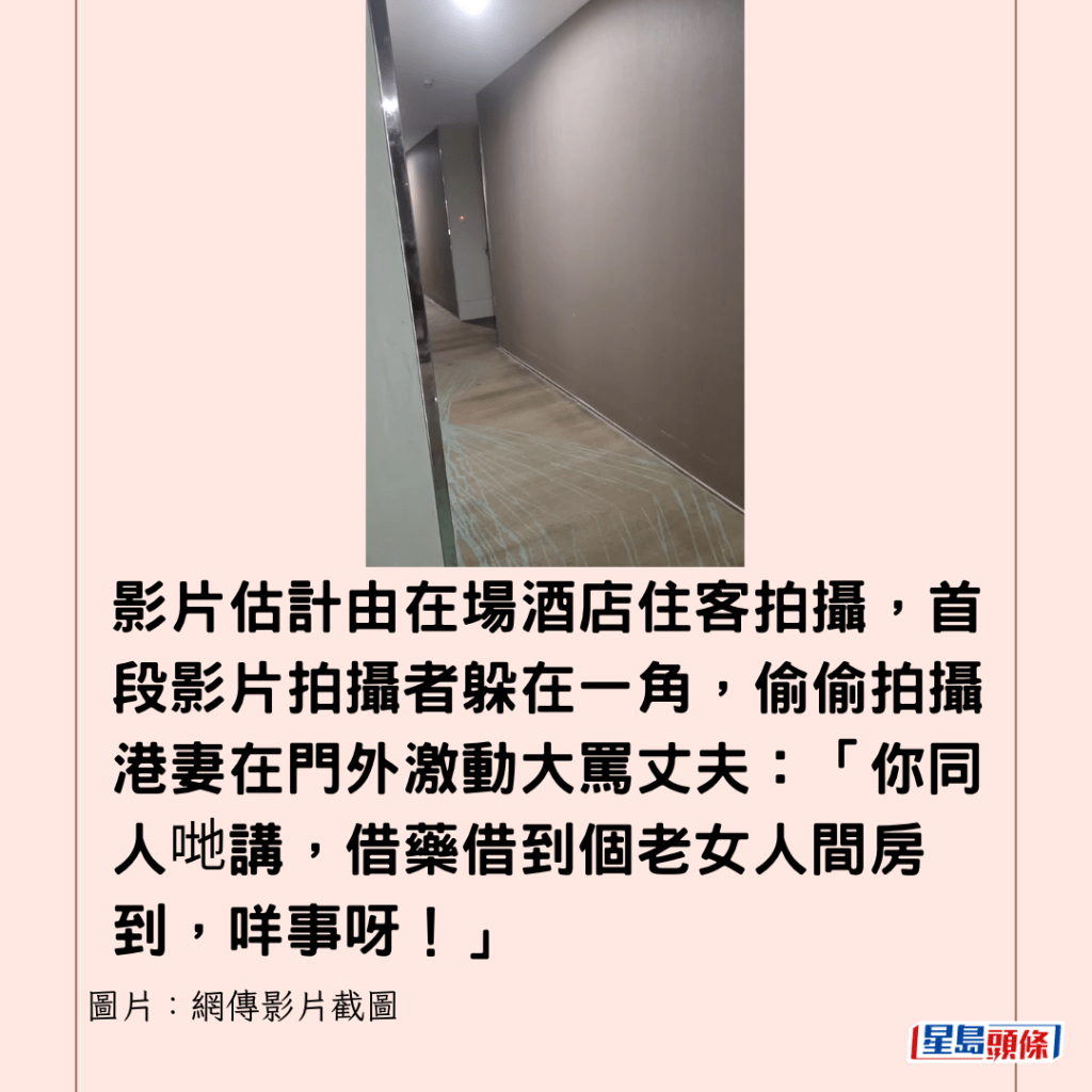 影片估計由在場酒店住客拍攝,首段影片拍攝者躲在一角,偷偷拍攝港妻在門外激動大罵丈夫:「你同人哋講,借藥借到個老女人間房到,咩事呀!」