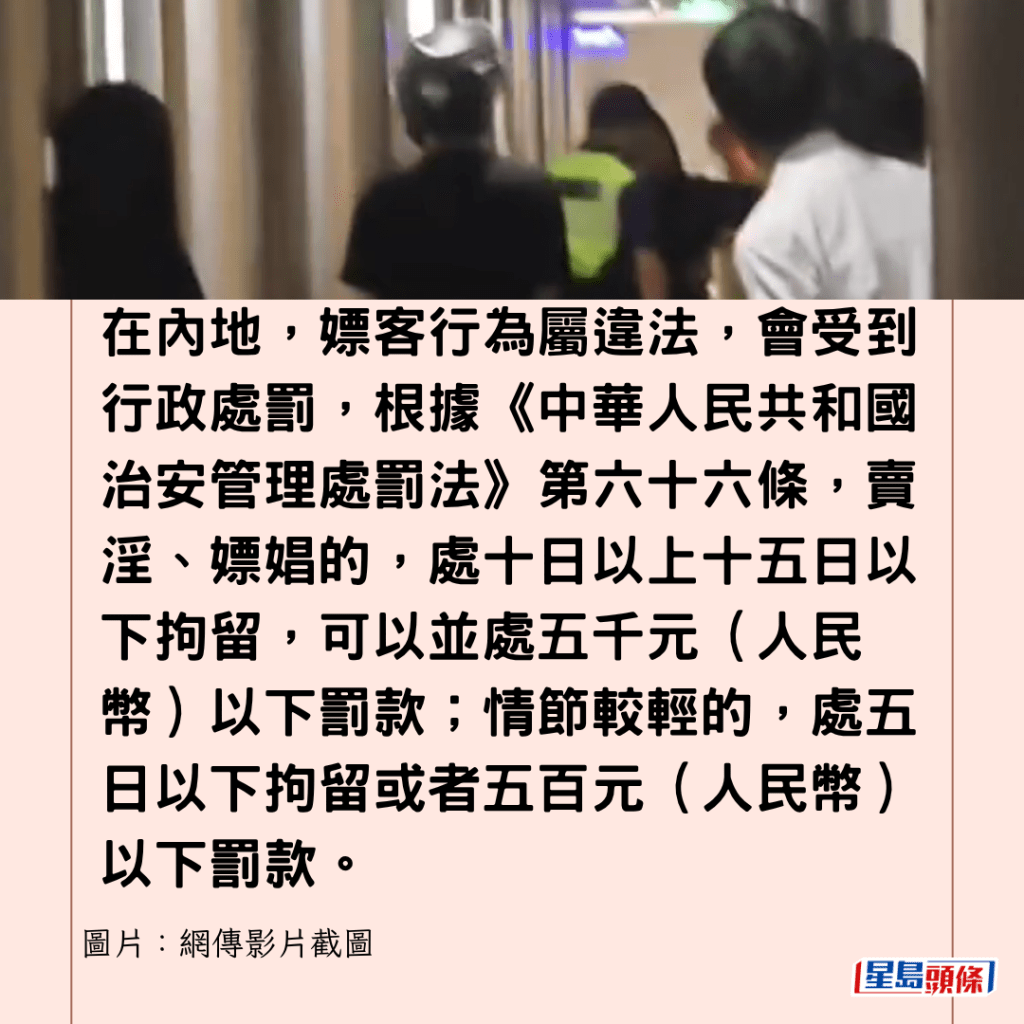 在內地,嫖客行為屬違法,會受到行政處罰,根據《中華人民共和國治安管理處罰法》第六十六條,賣淫、嫖娼的,處十日以上十五日以下拘留,可以並處五千元(人民幣)以下罰款;情節較輕的,處五日以下拘留或者五百元(人民幣)以下罰款。