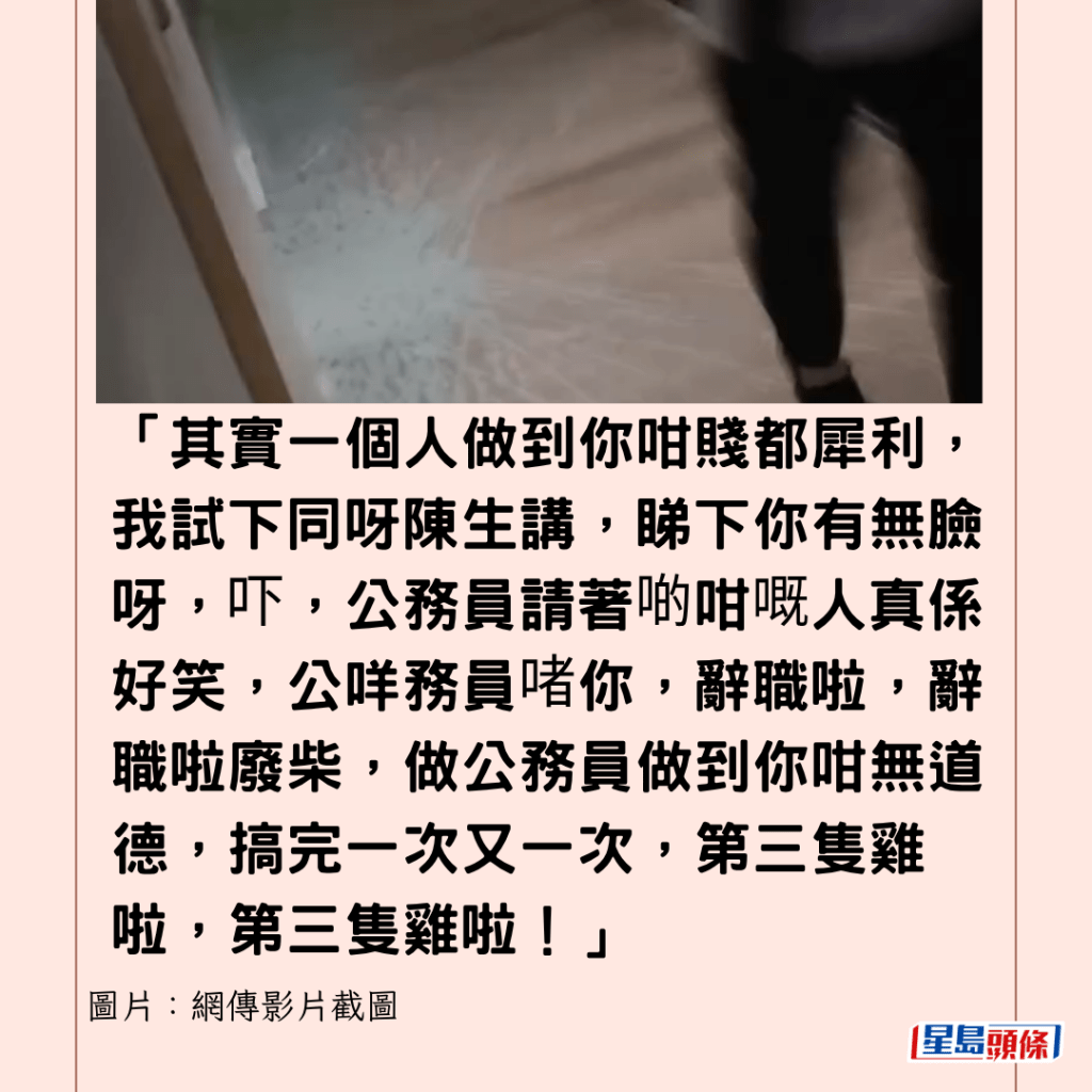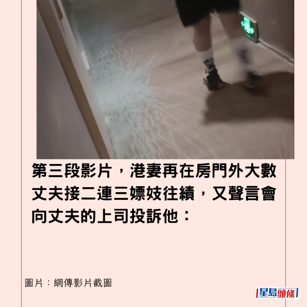 第三段影片,港妻再在房門外大數丈夫接二連三嫖妓往績,又聲言會向丈夫的上司投訴他:「其實一個人做到你咁賤都犀利,我試下同呀陳生講,睇下你有無臉呀,吓,公務員請著啲咁嘅人真係好笑,公咩務員啫你,辭職啦,辭職啦廢柴,做公務員做到你咁無道德,搞完一次又一次,第三隻雞啦,第三隻雞啦!」