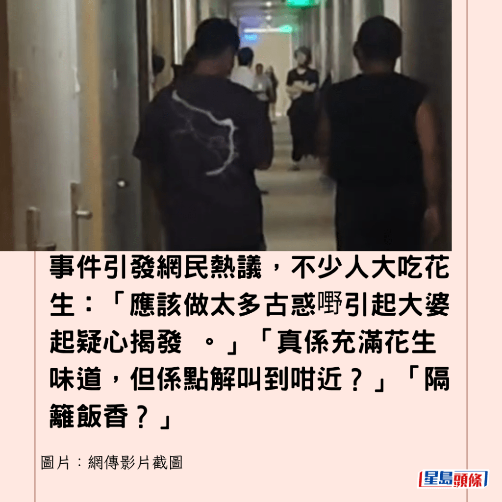 事件引發網民熱議,不少人大吃花生:「應該做太多古惑嘢引起大婆起疑心揭發 。」「真係充滿花生味道,但係點解叫到咁近?」「隔籬飯香?」