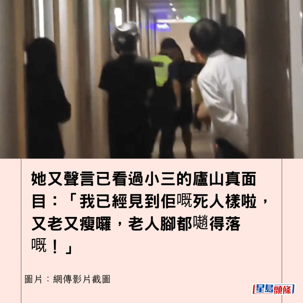 她又聲言已看過小三的廬山真面目:「我已經見到佢嘅死人樣啦,又老又瘦囉,老人腳都𡁻得落嘅!」