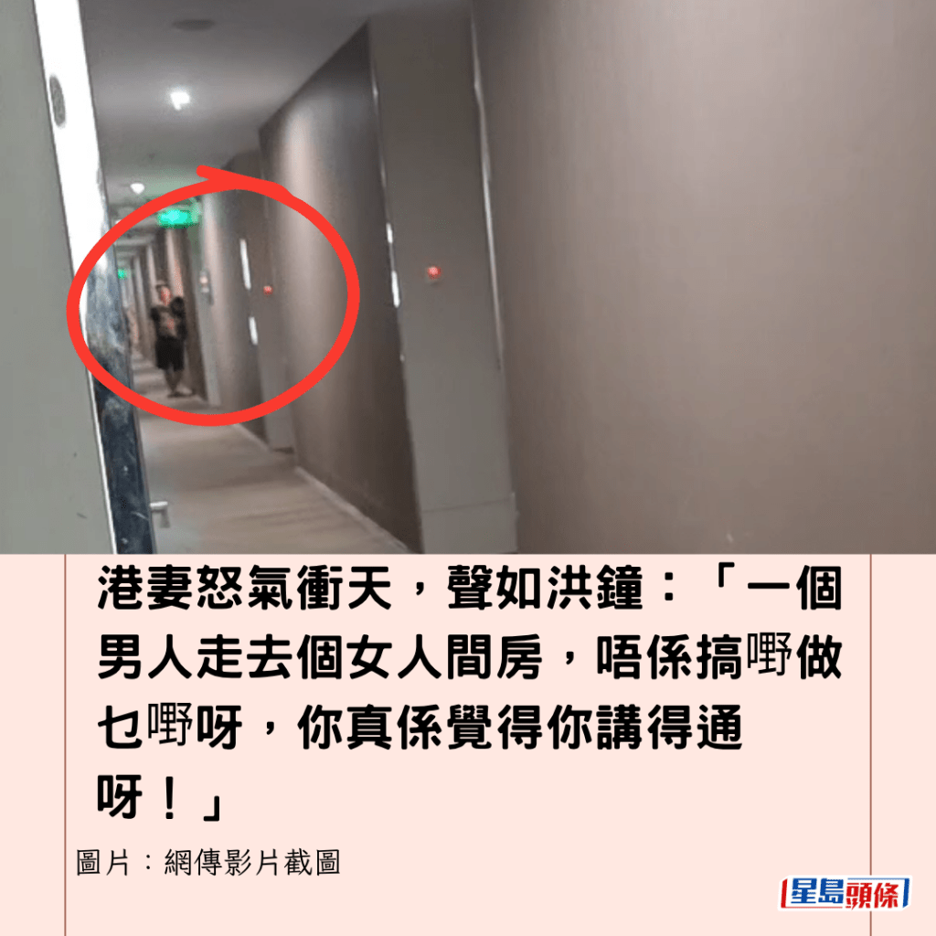 港妻怒氣衝天,聲如洪鐘:「一個男人走去個女人間房,唔係搞嘢做乜嘢呀,你真係覺得你講得通呀!」