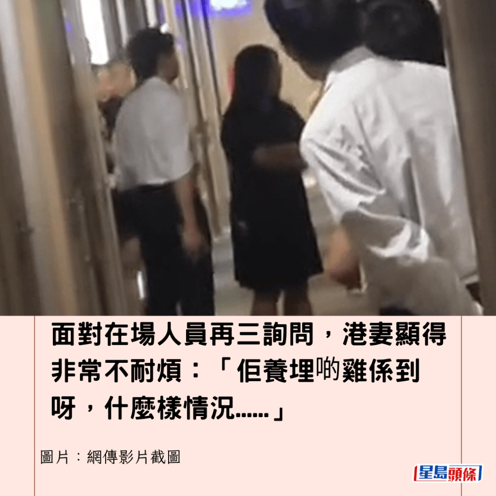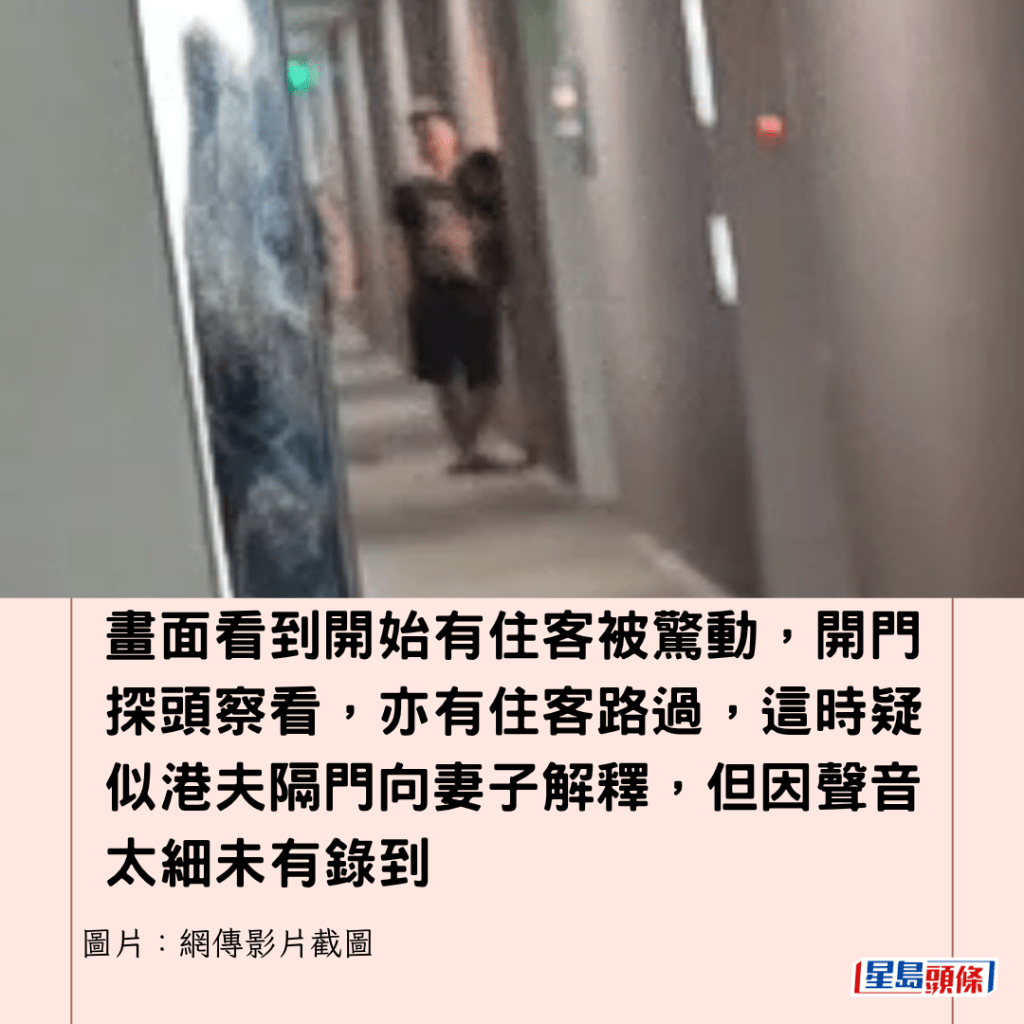 畫面看到開始有住客被驚動,開門探頭察看,亦有住客路過,這時疑似港夫隔門向妻子解釋,但因聲音太細未有錄到,只聽到港妻非常不滿丈夫的解釋:「你唔好以為你講啲大話可以呃到我,晨早我呢世唔會信你㗎啦,唔該你收聲啦!」