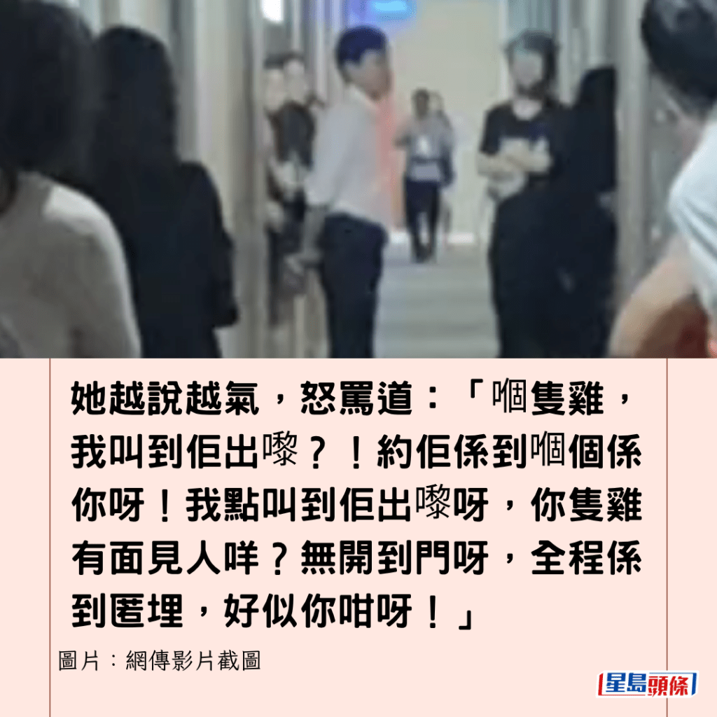 她越說越氣,怒罵道:「嗰隻雞,我叫到佢出嚟?!約佢係到嗰個係你呀!我點叫到佢出嚟呀,你隻雞有面見人咩?無開到門呀,全程係到匿埋,好似你咁呀!」